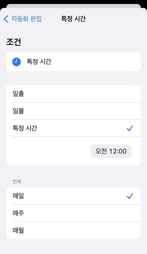 특정시간을 오전 12:00 으로 설정해주고 반복은 매일.