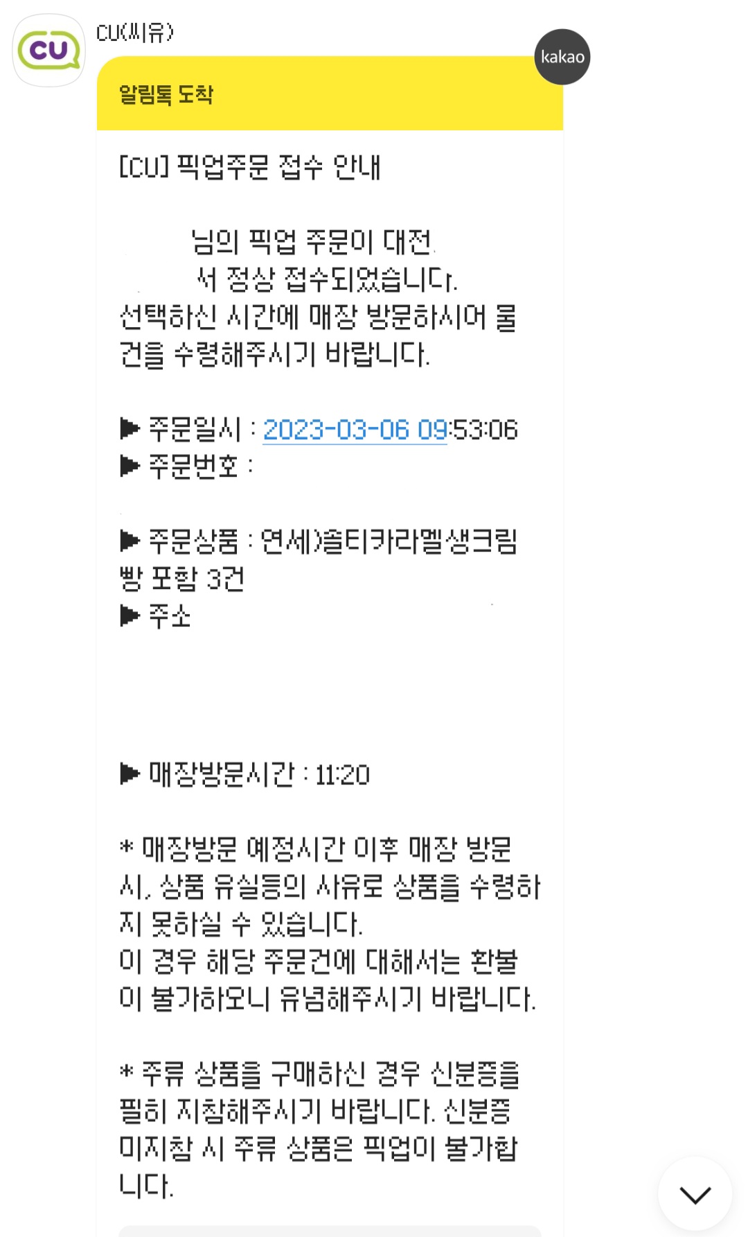 픽업을 완료했더니 완료카톡도 왔습니다!!