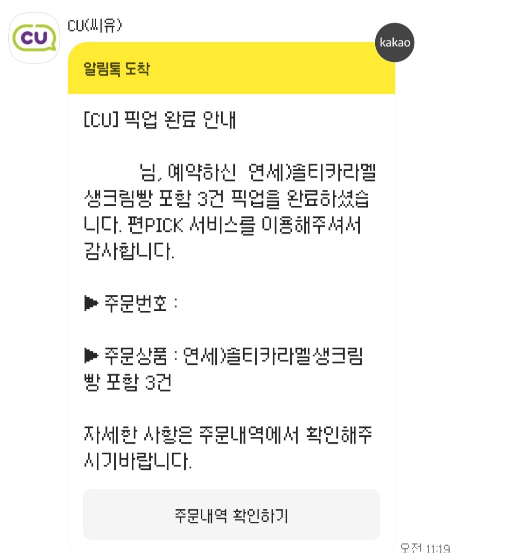 바로 cu에서 카톡이 와요.
