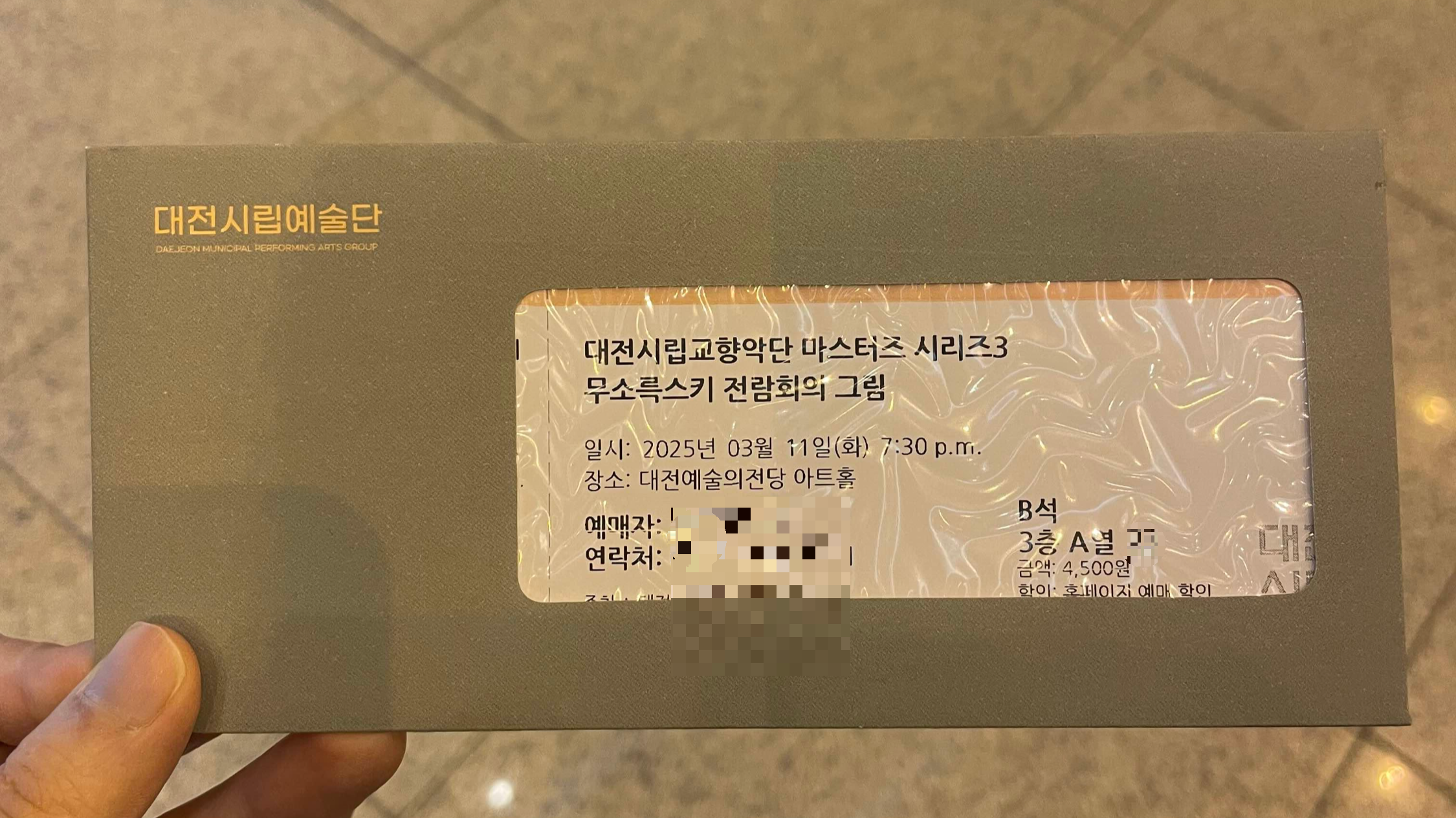 이번에 다녀온 공연은 대전예술의전당에서 열린 대전시립교향악단 마스터즈 시리즈3로, 무소륵스키의 전람회의 그림을 감상하고 왔습니다. 올해 첫 클래식 공연이라 그런지 한 해를 여는 기분이 들더라고요.
