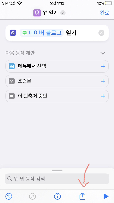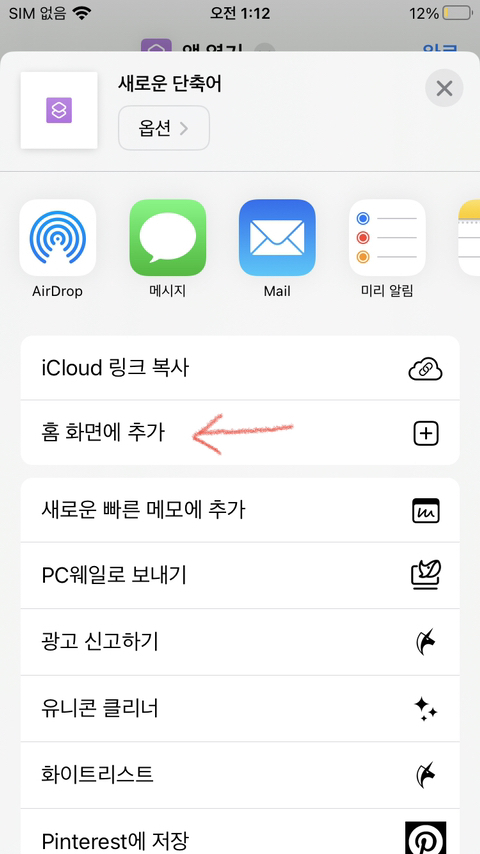 1번의 방법처럼 단축어에서 홈화면 에 아이콘을 만들어주면 된다.